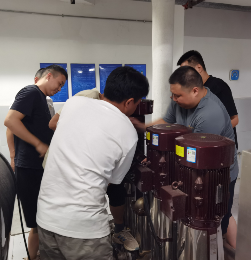 6月中旬,該小區(qū)有用戶反映水壓不穩(wěn)定。豪鵬二次供水公司收到信息立即組織人員前往現(xiàn)場排查,確認(rèn)是一臺(tái)水泵電機(jī)出了故障,引發(fā)電壓波動(dòng)所致。面對突發(fā)情況,公司迅速響應(yīng),立即組織人員對故障電機(jī)進(jìn)行拆解維修。6月17日下午,維修工作進(jìn)入電機(jī)重新安裝的關(guān)鍵階段,公司抓住這次實(shí)戰(zhàn)機(jī)會(huì),組織5名青年員工參與到此次技術(shù)練兵。通過此次培訓(xùn),員工們不僅掌握了電機(jī)維修與安裝的相關(guān)理論和維護(hù)技巧,更在實(shí)戰(zhàn)中深化了對二次供水設(shè)施運(yùn)行原理的理解。
