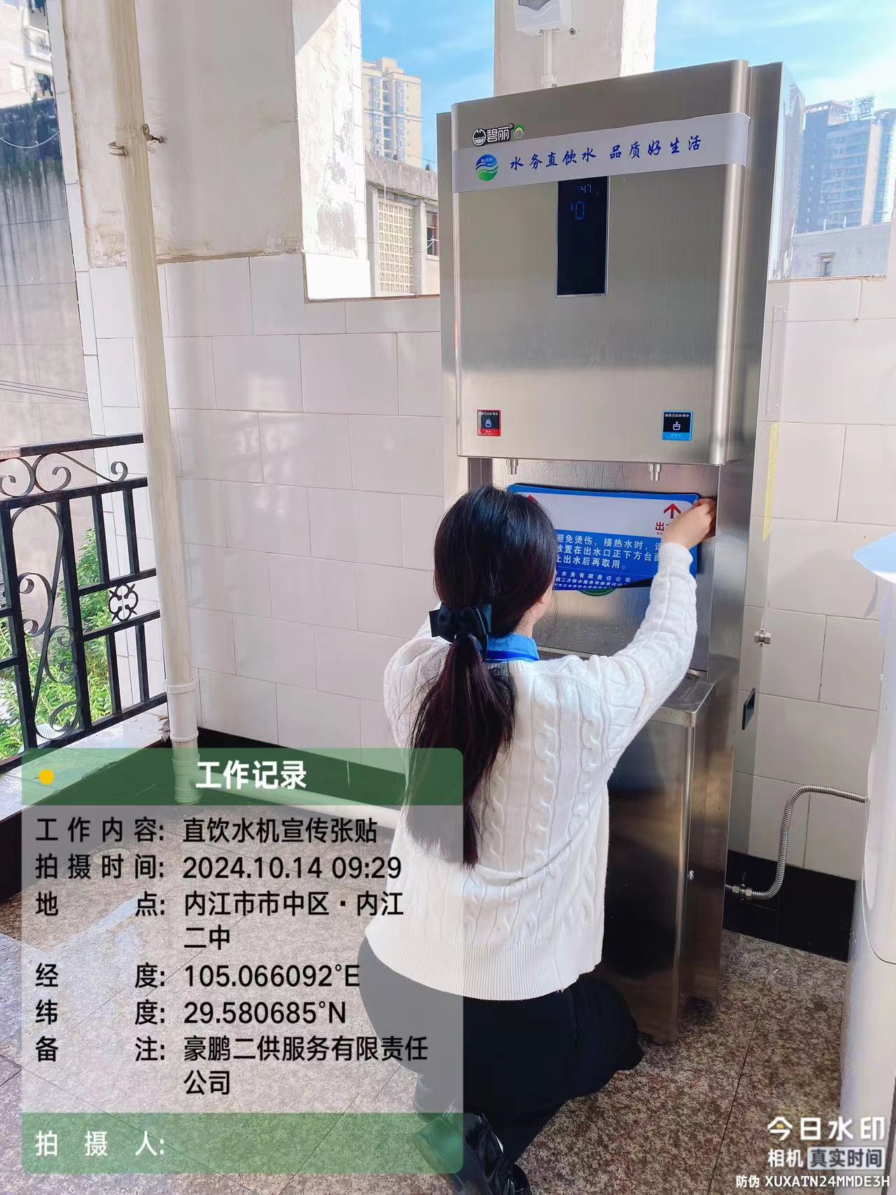 近期,內(nèi)江二中(沱中路校區(qū)) 21 臺(tái)直飲水設(shè)備順利完成了安裝,豪鵬公司積極跟進(jìn)完善配套服務(wù),在直飲水設(shè)備上張貼了運(yùn)維記錄表及溫馨提示。