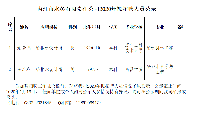 內(nèi)江市水務(wù)有限責(zé)任公司2020年擬招聘人員公示