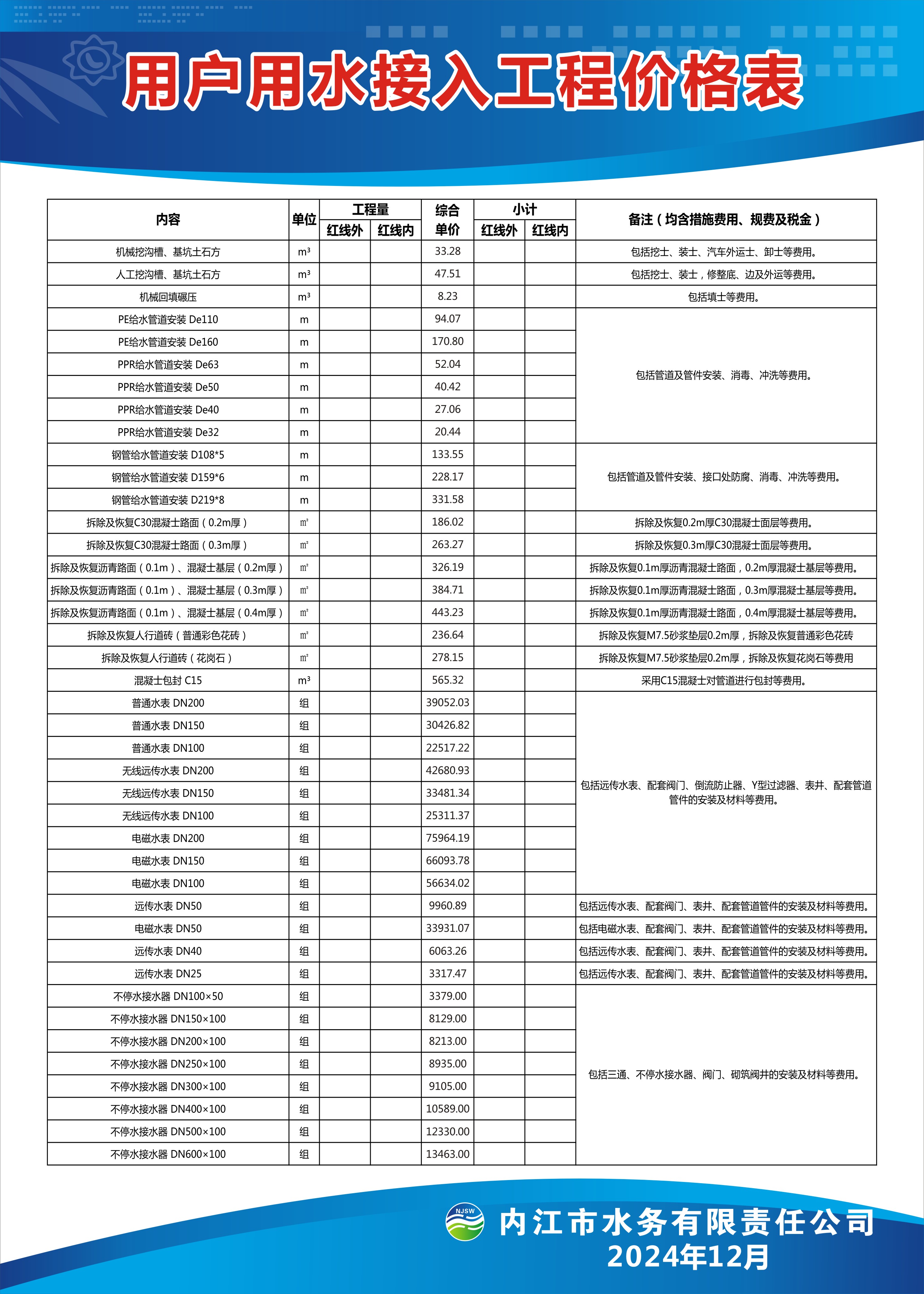 內(nèi)江市水務(wù)有限責(zé)任公司用戶(hù)用水接入工程價(jià)格表